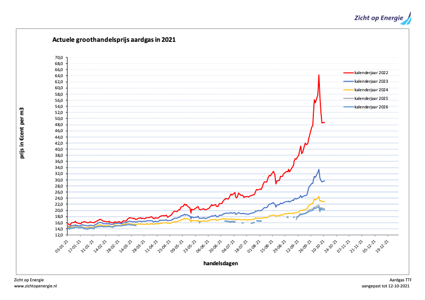 De gasprijs bestaat uit meerdere componenten. Onze researchafdeling verwacht dat de gasprijs in de termijnhandel tot het voorjaar van 2022 zal oplopen tot 110 à 130 euro per megawattuur (mwh). De energiekost, is slechts een onderdeel van de totale gasprijs.